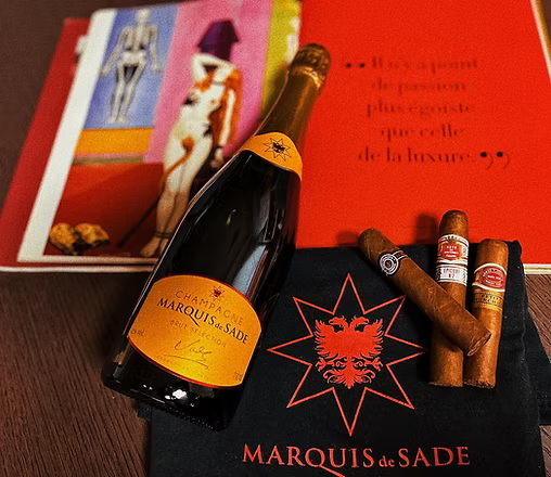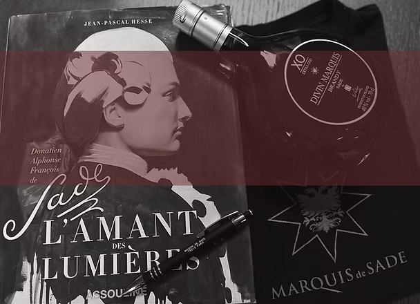 Bring everywhere you go a book of the Marquis, his perfume, and travel casual wearing the t-shirt and carrying a bottle of Champagne to be ready for any celebration or party!